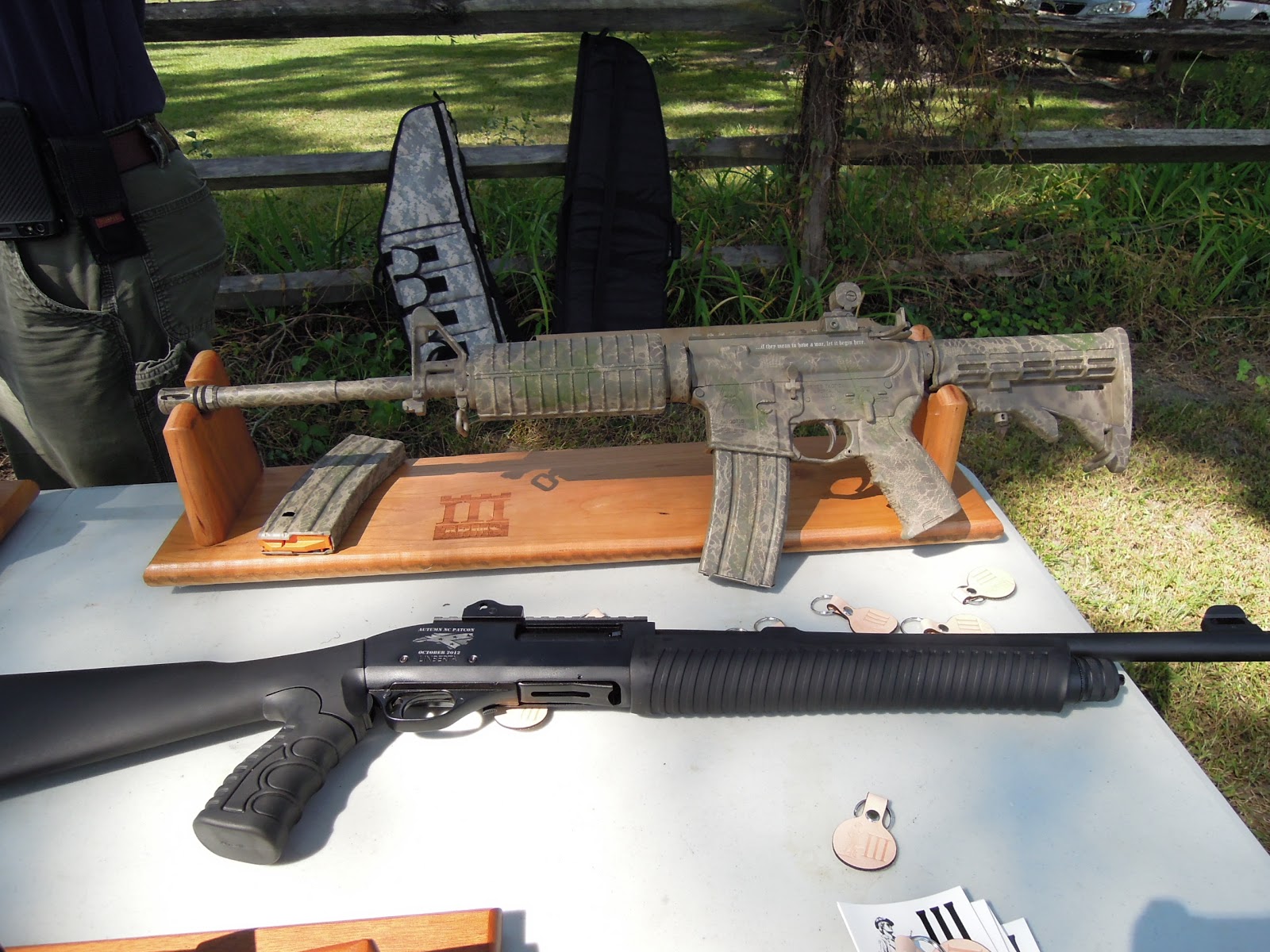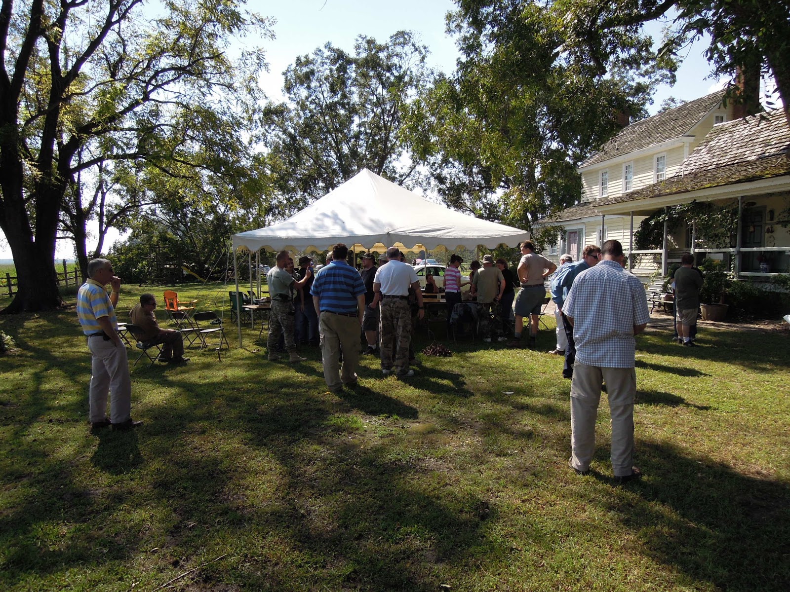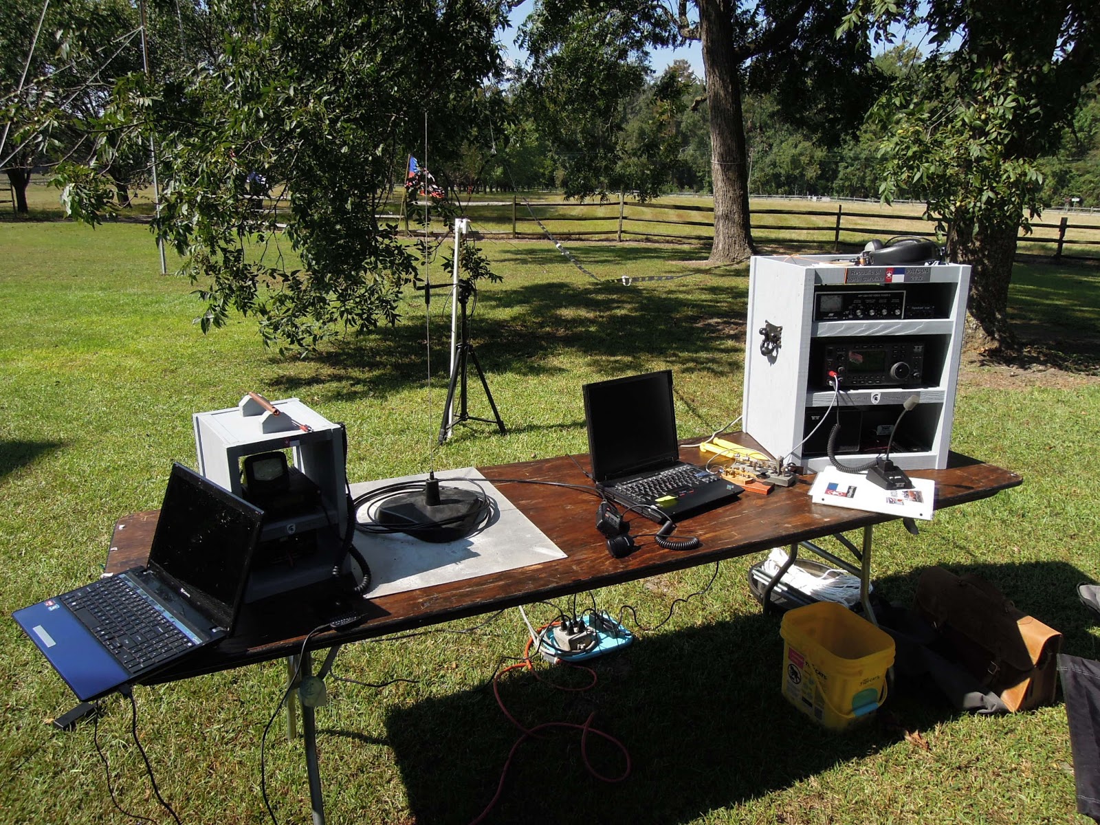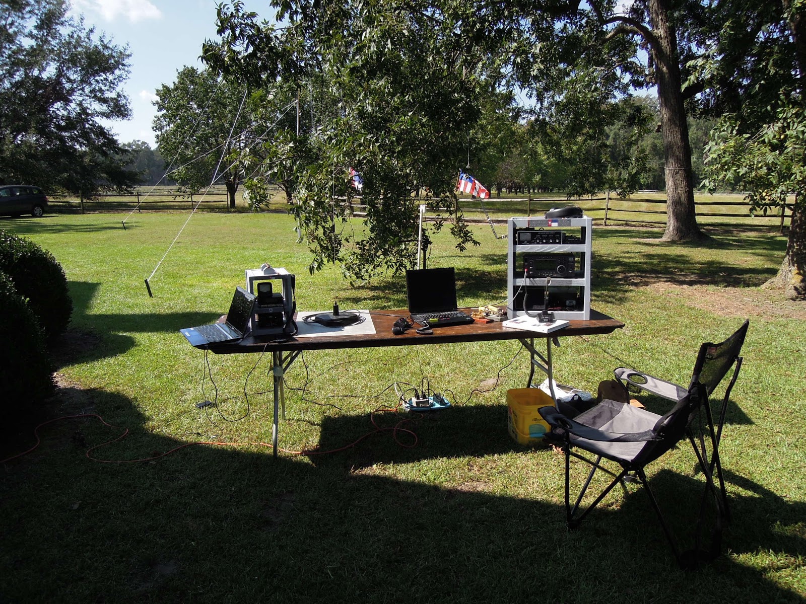 DeleteThe box on the left holds an Alinco 605 (144/440), SWR meter and AC power supply. On the table sits a Larson dual band whip on a sturdy automotive mag-mount. The PVC pipe standing against the camera tripod holds a homebrew 144/440 ground plane.