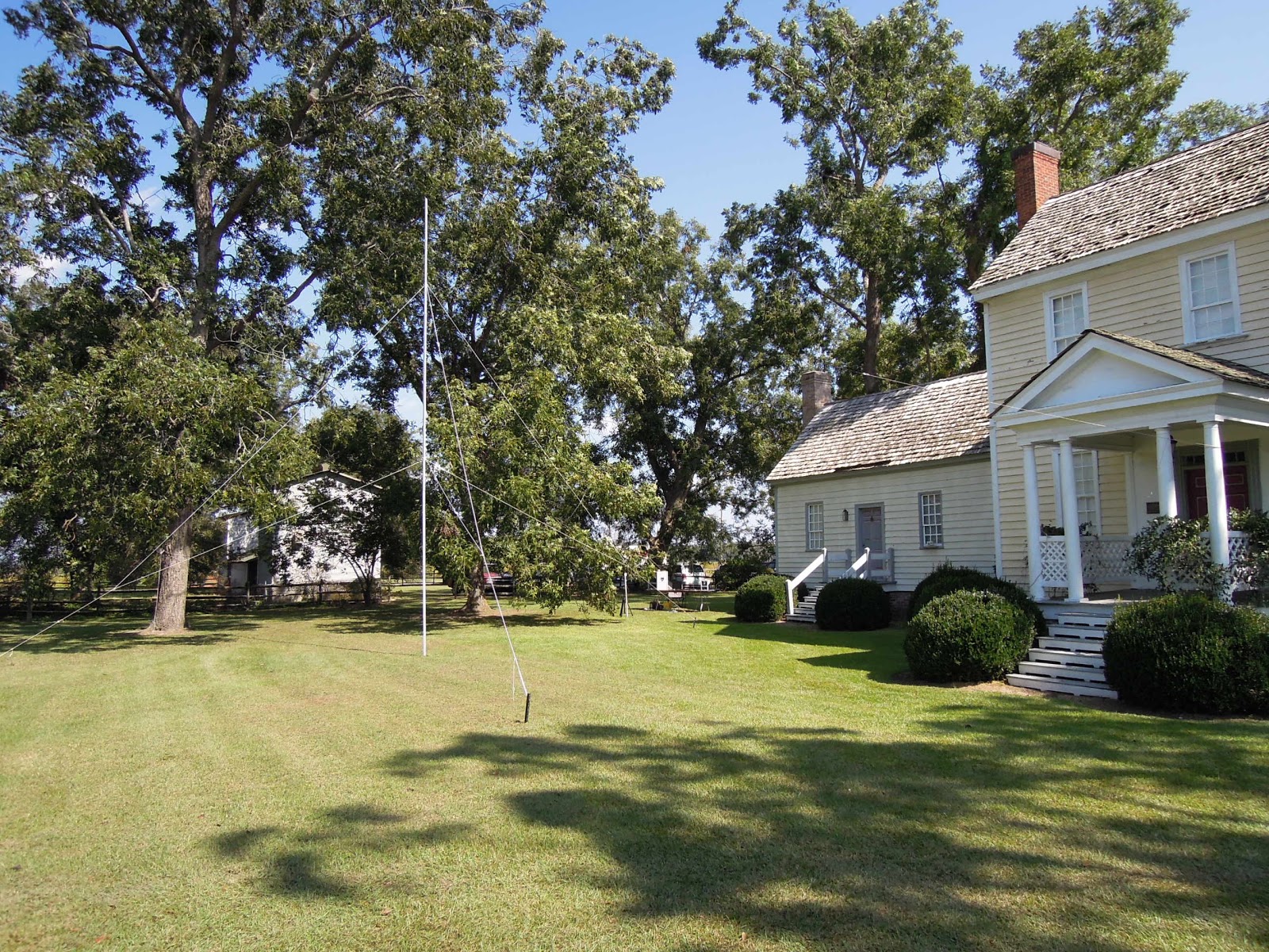 The gray "mast" holding the doublet is an "improv" design made from a split 12' 2x4 and an 8' 1x2 top section. The three pieces are rounded to slip into sections of 1.5" Type1 Sched40 PVC pipe. They're raised with a forked stick and guyed with clothes line to stakes.