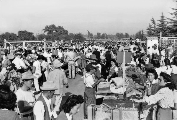 Japanese Americans at the Santa Anita Park race track assembly area. They'll be transferred to internment camps in states far from the west coast. Note the barracks in the far distance, on the race track itself.