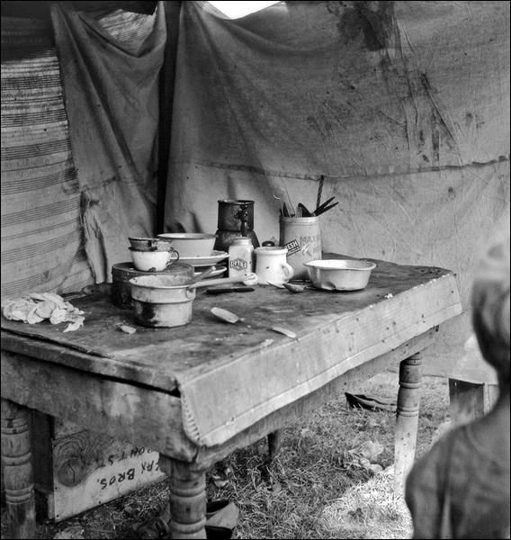 1936. Table in a migrant worker's tent, Sacramento, California.