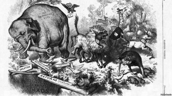 The origin of the elephant as a symbol of the Republican Party occurred in 1874 after a political cartoon by Thomas Nast appeared in the popular New York newspaper, “Harper’s Weekly.” It was during the congressional elections of that year when Nast, a renowned Republican satirist, drew a picture of the Democratic donkey dressed in a lion’s skin frightening away all the animals except one, an elephant that Nast dubbed “the Republican vote.” The cartoon was an instant hit with Republicans who quickly adopted the mighty animal as the party’s emblem.