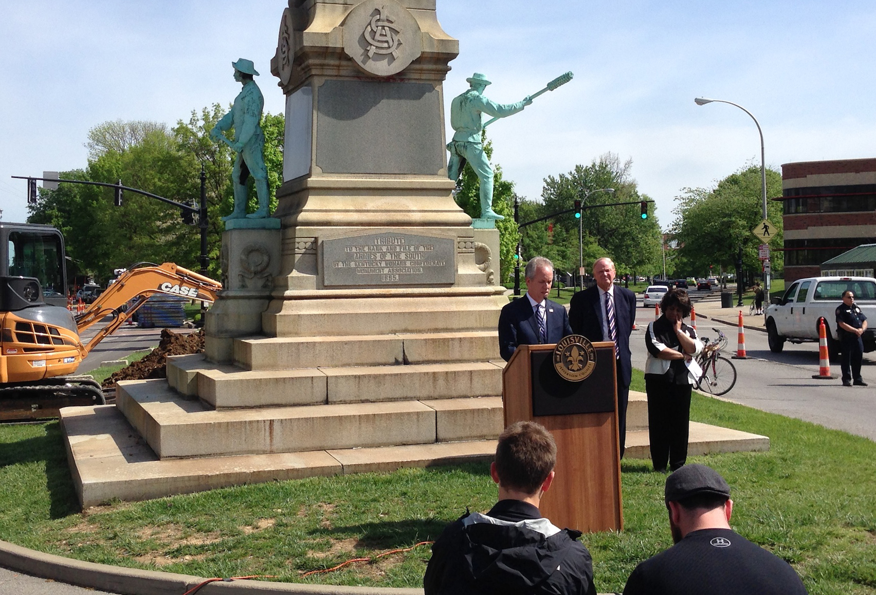 The stone monument honoring Kentuckians who died for the Confederacy in the Civil War will be moved to another location, University President James Ramsey and Louisville Mayor Greg Fischer said during a surprise announcement Friday. The monument is capped with a statue of a Confederate soldier.